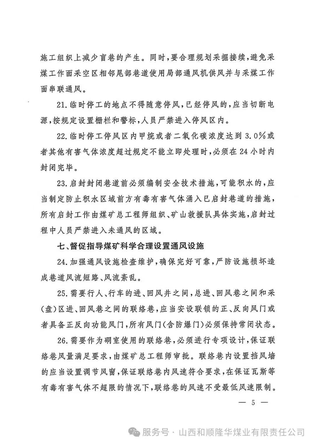 “通风三十条”聚焦事故暴露的突出问题和基层反映较多、现行法规标准不明确的通风安全类问题,着力补漏洞、强弱项,为基层煤矿安全监管监察人员开展煤矿通风类安全检查提供有效指导。一是督促指导煤矿实现分区通风,对生产水平、生产采(盘)区分区通风提出要求,回风要直接引入总回风巷或主要回风巷。二是实现采掘工作面独立通风,采掘工作面回风要源头避免相互切断安全出口。三是合理配置风量,要如实公示各用风地点实际风量,严防隐瞒采掘工作面破坏通风系统稳定。四是强化通风系统基础保障,积极推进中央变电所、采区变电所全部实行独立通风。五是加强回风系统管理,对于巷道变形超过原设计巷道断面三分之二及以上或者影响通风行人的、风速超限的、严重失修的,应当及时进行维修。六是加强局部通风管理,合理安排巷道施工顺序,确保施工连续,避免临时停工,从施工组织上减少盲巷的产生。七是科学合理设置通风设施,加强通风设施检查维护,确保完好可靠,严防设施损坏造成巷道风流短路、风流紊乱。八是规范设置采空区密闭墙,密闭墙位置距全风压巷道口应当不大于5米,墙体厚度、强度要确保密闭效果。